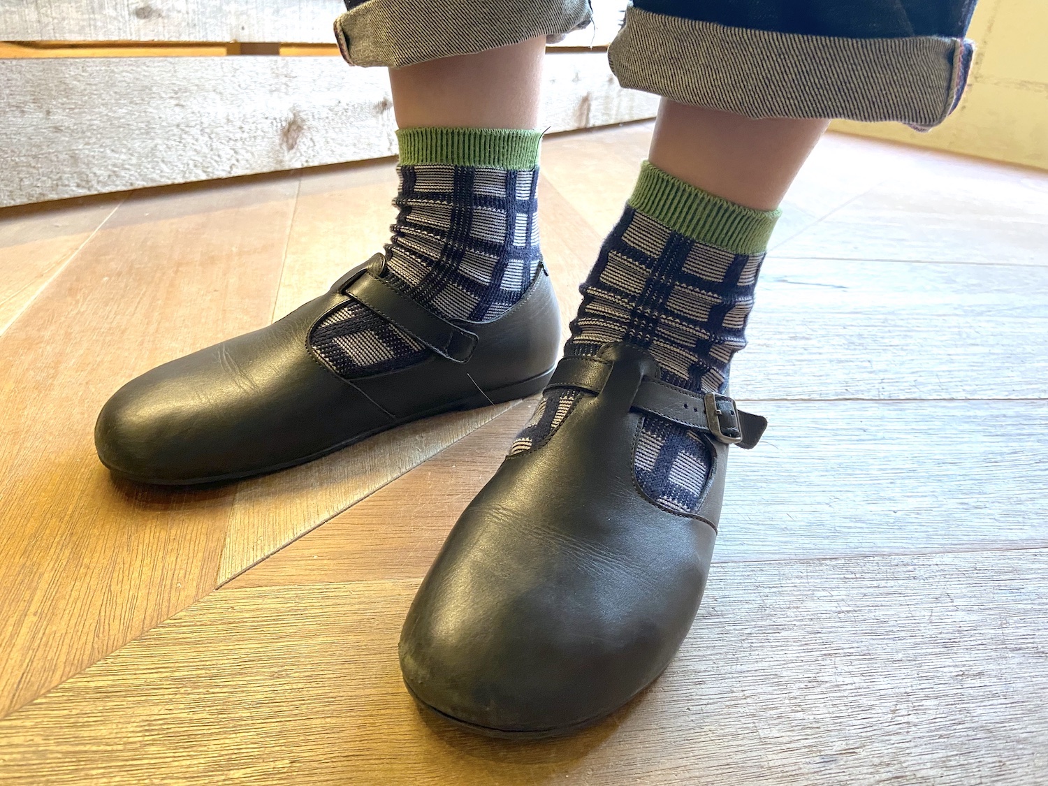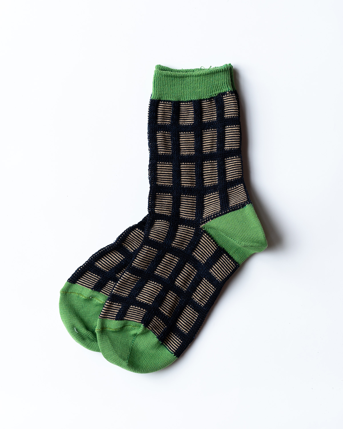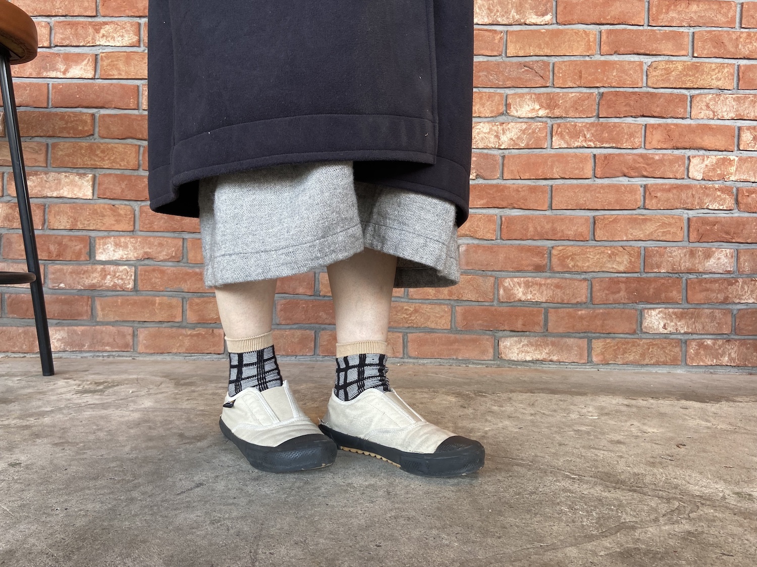 大きめのブロックチェック柄と細ボーダーの組み合わせがデザインポイントです。意外と合せやすい配色と柄です。