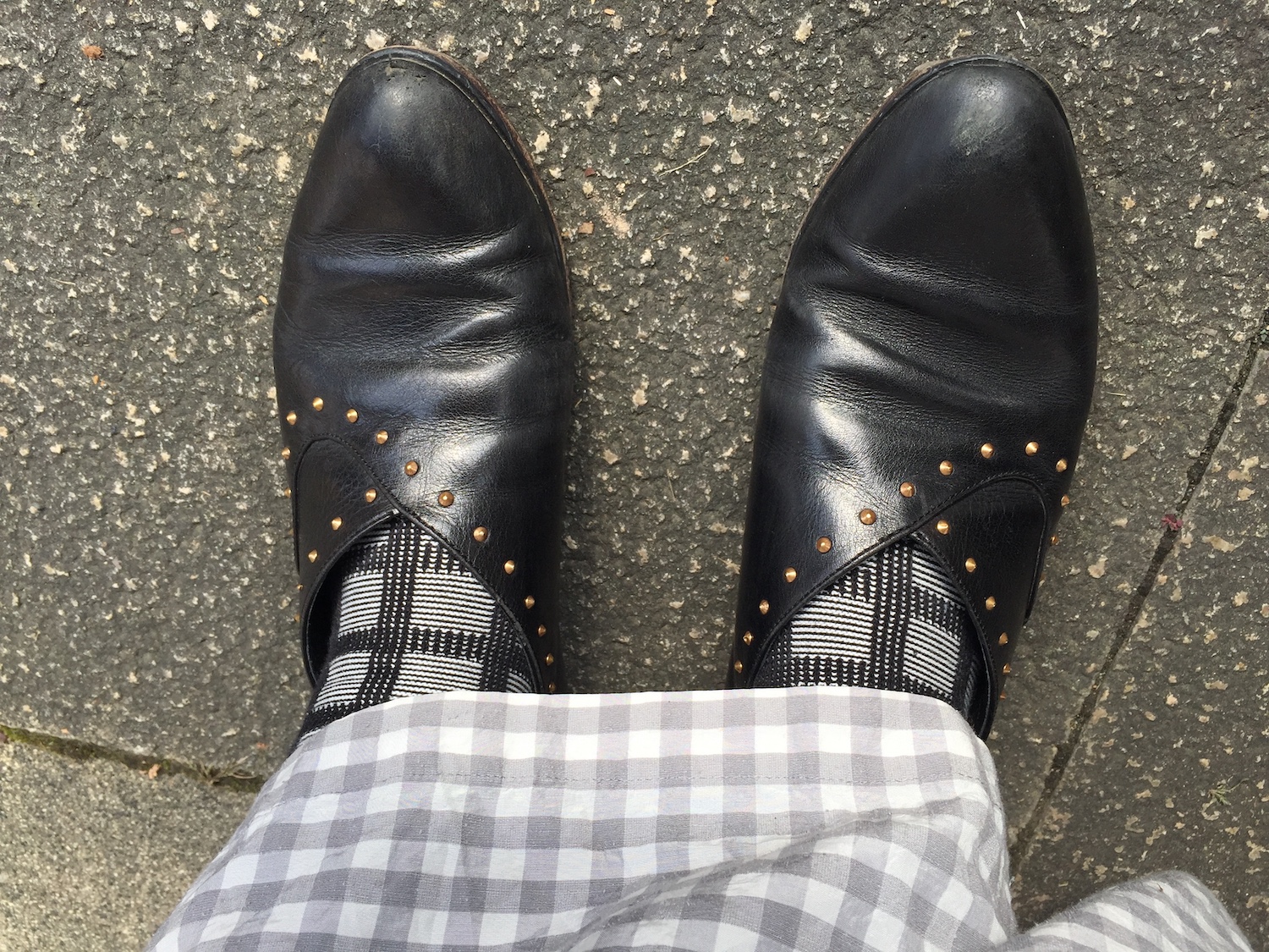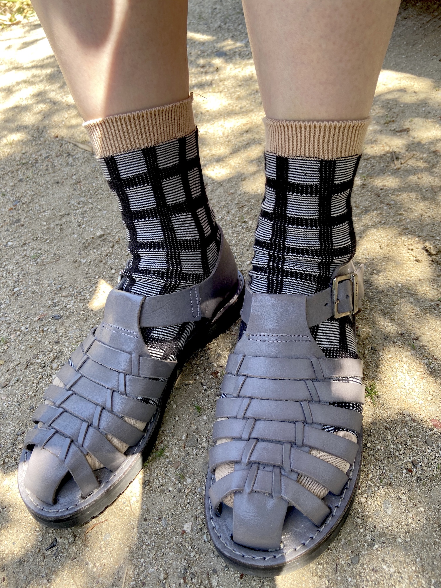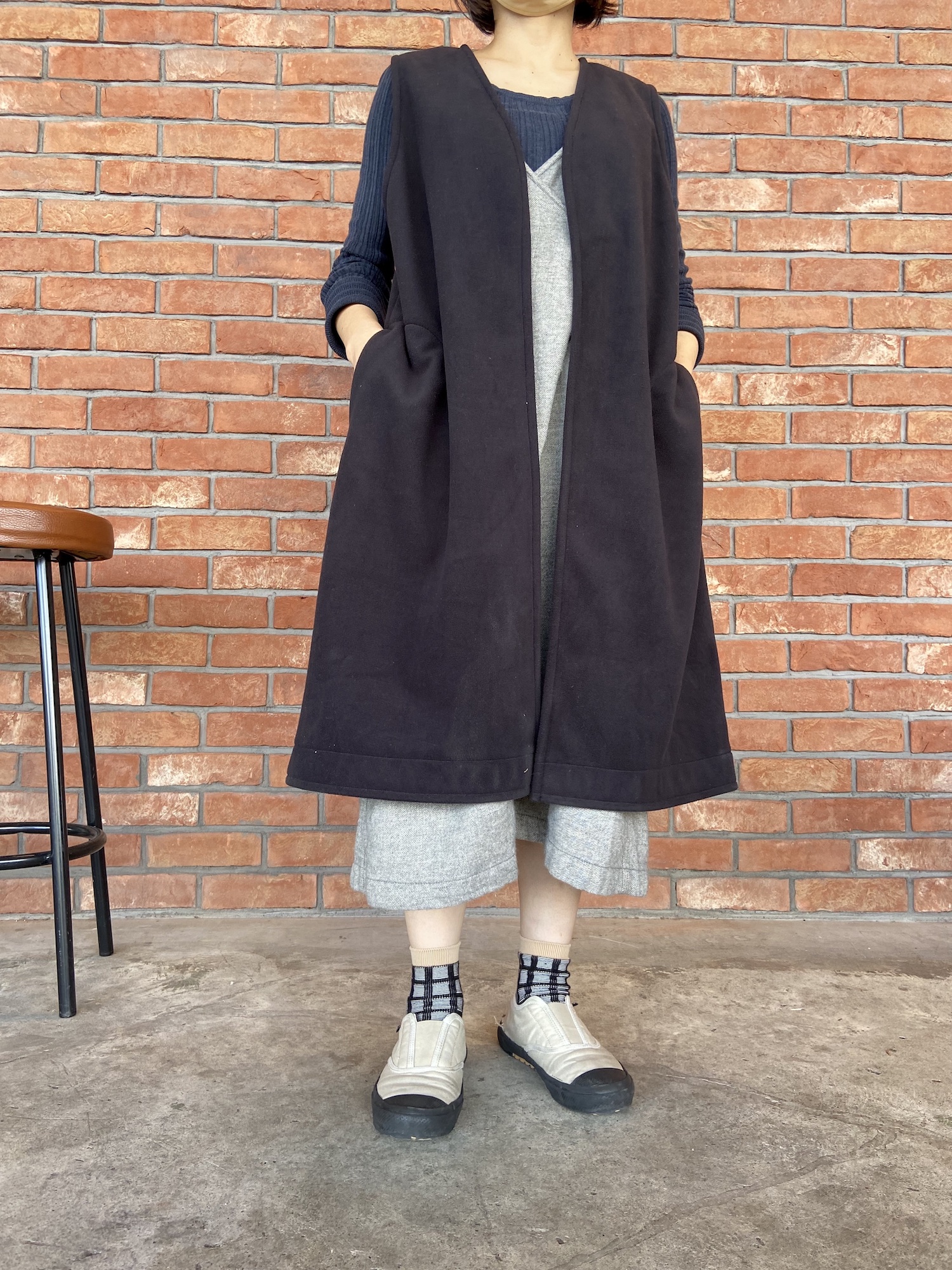 大きめのブロックチェック柄と細ボーダーの組み合わせがデザインポイントです。意外と合せやすい配色と柄です。
