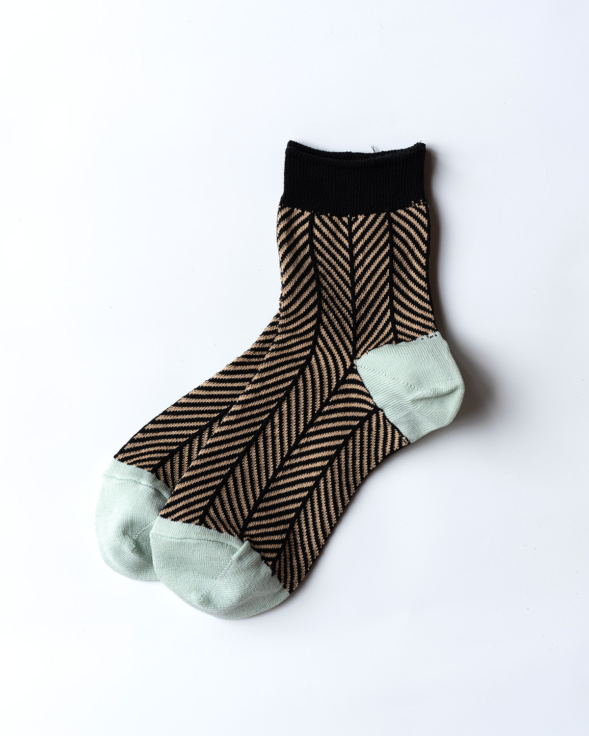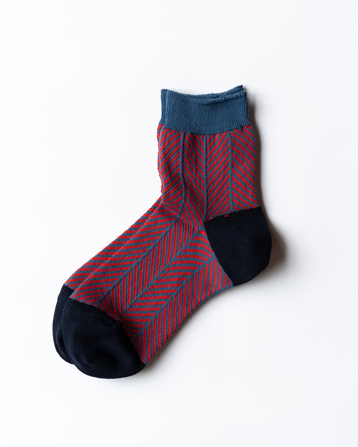 アメリカ産スーピマコットンを使用したなめらかな肌触りとやわらかさがとても気持ちのいいくつ下です。定番柄のヘリンボーンをカラフルな配色で作りました。